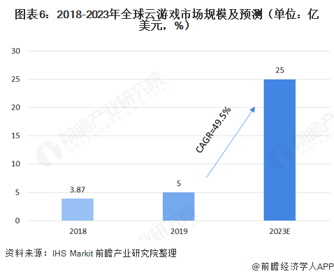根据IHS Markit公布的数据显示,2019年全球云游戏市场国模为5亿美元,随着云游戏平台的成熟、5G通信技术应用落地,云游戏市场将迎来快速增长,IHS Markit预计,到2023年全球云游戏市场规模将达到25亿美元,2019-2023年年均复合增长率达49.5%。