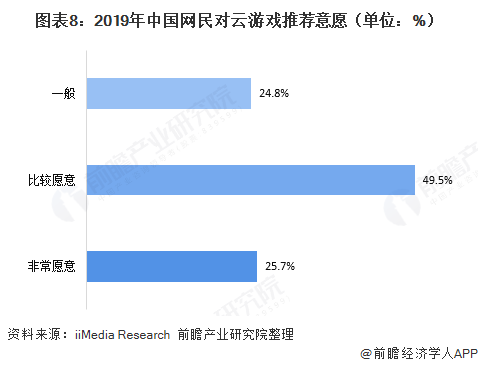 尽管目前中国了解云游戏的用户规模较少,但根据iiMedia Research公布的调研数据显示,75.2%的受访网民表示愿意向周围朋友推荐云游戏,推荐意愿相对较低的受访网民占24.8%。游戏的社交属性越来越强,用户推荐意愿较高表明云游戏的用户粘性较好。