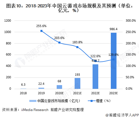 根据iiMedia Research公布的数据显示,2018年云游戏市场规模约为6.3亿元,2019年仅为22.4亿元,整体规模较小。随着云游戏内容的不断丰富,用户体验的逐渐提升,用户付费意愿及付费水平有望随之增长,同时受益于云游戏用户规模的快速增长,云游戏平台广告变现能力逐渐增强,我国云游戏市场规模有望迎来高速增长,预计到2023年我国云游戏市场规模将达到986.4亿元。