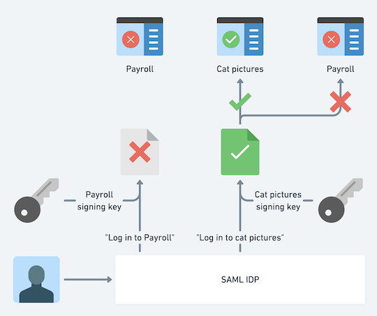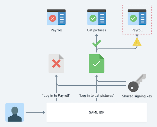 核心问题是缺乏受众限制验证,换句话说,SP没有检查断言是否针对它。SAML的设计思想是你的IDP将只有一个签名密钥,你可以将它分发给与你集成的每个人。考虑到SAML的学术背景,它应该是一个合作协议,组织之间密切合作。现代企业SAML忽略了所有这些有趣的特性,因为它们是巨大的安全和配置噩梦。