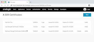 这不是默认的,因为在默认情况下,OneLogin使用一个共享签名密钥。你可以尝试在单个SAML配置的设置中更改此秘钥,但不能添加新的秘钥。你必须导航到单独的“证书”页面以创建新证书,但是一旦完成,就可以为每个SP创建唯一的签名密钥。
