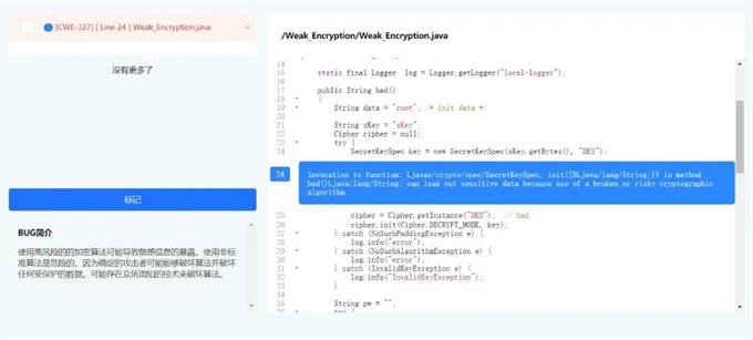 用Wukong检测上述程序代码,则可以发现代码中存在着“使用已破解或危险的加密算法” 导致的代码缺陷,如下图: