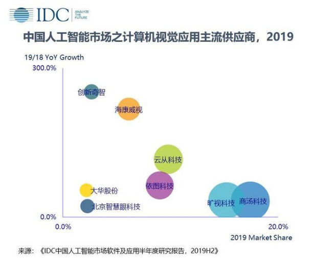 华为、百度等科技巨头,还有旷视、云从等AI独角兽入局,对于海康威视、大华股份等传统安防来说,行业涌现出众多参与者,竞争加剧将带来巨大压力。以及来自旷视、商汤科技等AI独角兽实力不可小觑。结合IDC给出的数据显示,旷视、商汤、云从、依图作为四大机器视觉独角兽,占据中国人工智能计算机视觉应用超一半市场份额,这些后浪们在人工智能市场领先于海康威视、大华股份等传统安防巨头。