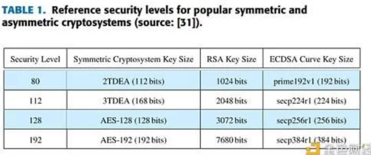 我们一般常用安全位级别,来评估公钥密码系统抵抗经典计算攻击的强度。此级别定义为经典计算机执行暴力攻击所需的工作量。表1列出了一些最通用的对称和非对称密码系统的安全级别。
