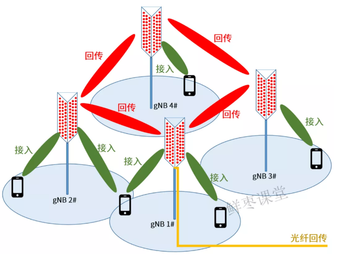 简单来说,某基站具有光纤回传资源,它周边的其它基站可以通过毫米波与这个基站建立回传关系,不需要每个基站都配备光纤回传资源,只需要提供一个电力,就可以了。