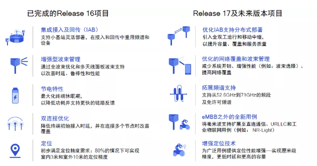 R16还引入了很多支持毫米波的5G NR增强特性,例如集成接入及回传(IAB)、增强型波束管理、双连接优化等。