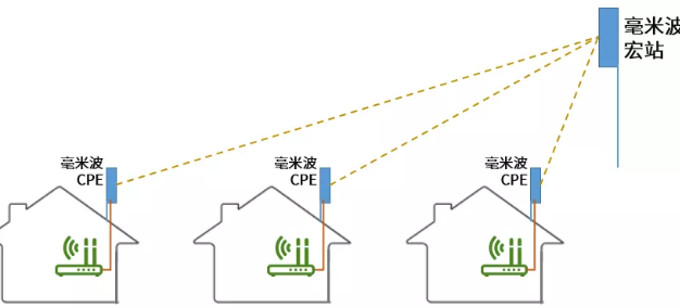 其实很简单,就是用毫米波做最后一公里的接入。将5G信号通过毫米波传送给用户家庭CPE设备,然后转换为Wi-Fi或有线信号,让用户实现宽带上网。如下图所示: