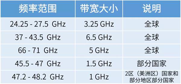 全球范围内,将24.25GHz-27.5GHz、37GHz-43.5GHz、66GHz-71GHz频段,标识用于5G及国际移动通信系统(IMT)未来发展。45.5GHz-47GHz、47.2GHz-48.2GHz频段,可以在部分国家地区用于5G及IMT。