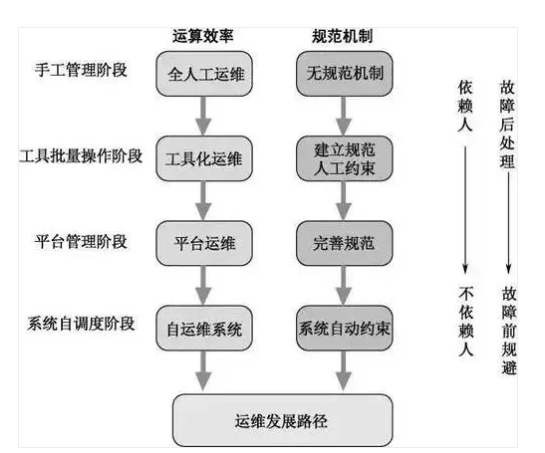 在整个运维的发展过程中,希望所有的工作都自动化起来,减少人的重复工作,降低知识传递的成本,使我们的运维交付更高效、更安全,使产品运行更稳定。对于故障的处理,也希望由事后处理变成提前发现,由人工处理变成系统自动容灾。
