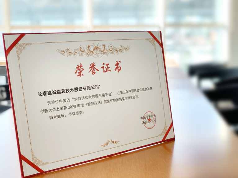 在此次论坛上,嘉诚信息凭借多年来在智慧政法领域作出的突出贡献,申报的“公益诉讼大数据应用平台”荣获“2020年度(智慧政法)信息化数据共享创新奖”称号。