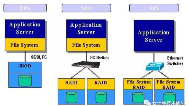 1、DAS:存储设备直接通过SCSI线缆或者FC的方式直接连到服务器上,SCSI环路最多可以支持16台设备,FC仲裁环可以支持126台设备;