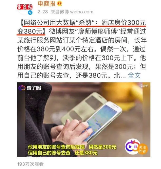 大数据杀熟,是去年以来网络上的热门话题,机票越搜越贵则是在线旅游疑似大数据杀熟的焦点。“搜了一次某个地方的机票,过一段时间再搜,价格就变了,而搜的次数越多,价格就变化得越厉害,换一个APP搜结果就会完全不同,这不是大数据杀熟是什么?”有网友反映。