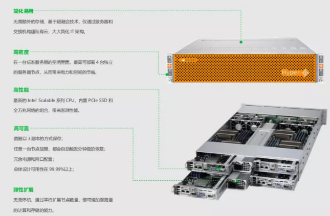 全栈融合:集成施耐德电气新一代IMDC智能微型数据中心+华胜天成旗下的华胜锐盈科技HyperX私有云,提高标准化,将服务器、存储、交换机、电源、散热、UPS、PDU、空调、远程监控、云服务集于一身,功耗低,体积小;