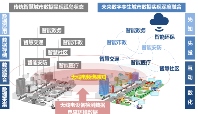 数字孪生城市是无线频谱数字孪生化的应用场景之一,数字孪生体在城市建设与发展中的核心价值在于,它能够在物理世界和数字世界之间全面建立实时联系,进而对城市物理实体全生命期的变化进行数字化。