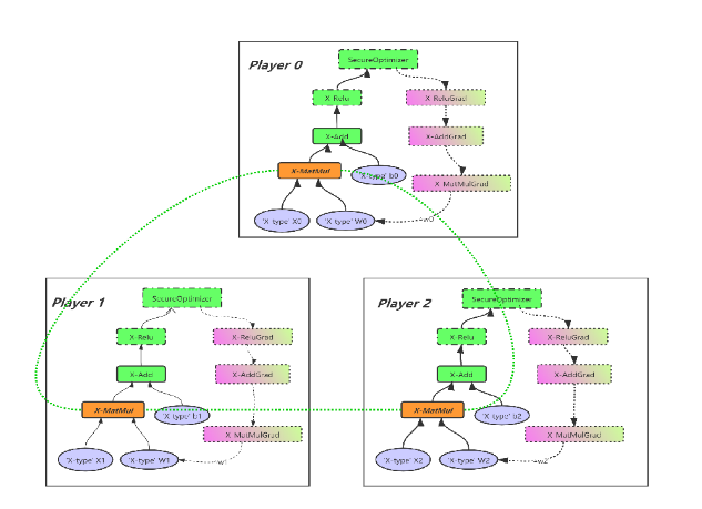 在执行过程中,各Player自身都是在按照这个DAG图在运行,特殊的地方在于在各个算子的内部执行过程中,各个Player会根据自己所属的角色遵循MPC协议执行不同的操作,这些操作即包括本地的在密文上的处理,也包括在多方之间进行强同步的通讯交互,传输大量随机数形式的密文。