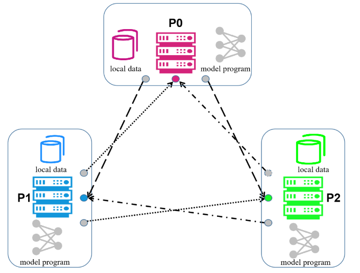 MPC技术本身就是要求多方(multi-party)参与的,一般称他们为Player,不同的MPC算法协议会有不同个数的参与方。以Rosetta中目前实现的三方协议SecureNN[2]为例,系统中存在三个逻辑参与方,P0、P1和P2。