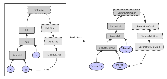 具体的,在Rosetta中,有两个阶段的Pass,一个在前端Python层的全局DAG构建过程中生效的Static Pass,会将原生Tensor转换为支持自定义密文类型的RttTensor,将原生Operation转换为支持tf.string格式输入输出的RttOp,并最终在图开始启动时进一步的转换为承载实际MPC操作的SecureOp。
