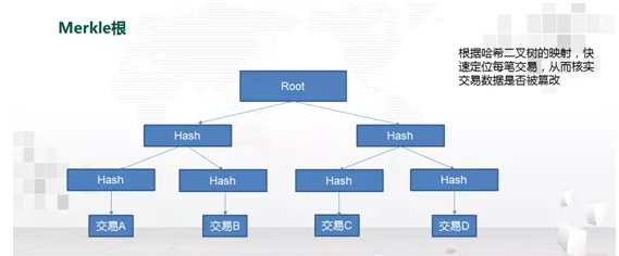 Merkle tree,默克尔树,哈希算法的另一个重要应用。二叉树依靠哈希指针建立。树的顶端叫做默克尔根(Merkle Root),Merkle Root也是一个hash值,它是怎么计算出来的呢?区块链中对每一笔交易做一个hash计算,然后把每2个交易的hash合并再做hash计算,例如交易A的hash值是h(A),交易B的hash值是h(B),对这2个交易合并Hash后就是h(hA&hb),依次不断往上合并计算,最后就得到Merkle Root了。