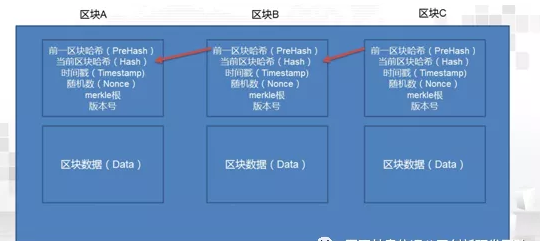 在区块链中,哈希算法主要就是把交易数据生成交易摘要(标识),同时哈希算法也对区块数据生成区块摘要(标识)。当前区块里面包含上一个区块的哈希值,后面一个区块又包含当前区块的哈希值,区块通过哈希指针相连,形成一个哈希指针链表,如下图: