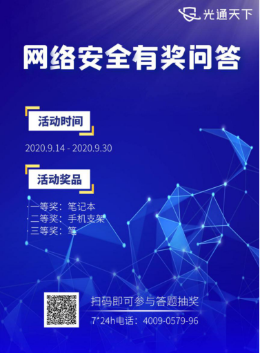 为增强全民网络安全意识,光通天下策划了“网络安全有奖问答”活动,并于9月14日正式发布。通过风趣幽默的网络安全问题,向民众传递网络安全观念,引导学习网络安全知识。活动将持续至9月30日,通过扫描活动海报上的二维码即可进入答题,与全国网民一决高下。