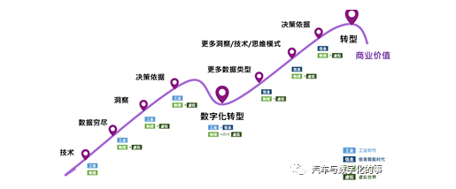 举例,从另一个角度理解信息化,数字化,数字化转型。工业时代的原生企业,与信息智能时代的互联网巨头这些数字原生企业相比,汽车行业等传统企业的数字化程度肯定还有差距,两者差距具体表现在,时代沉淀的包袱、基因和背景、组织架构,文化建设等因素都有一定的关系。