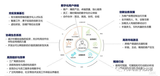 不同的企业需要根据自身价值主张,以及实施思路定制化,比如,华为提出“构建一个全感知、全联接、全场景、全智能的数字世界”,《传统产业数字化转型的模式和路径》提到的“利用新一代信息技术,构建数据的采集、传输、存储、处理和反馈的闭环,打通不同层级与不同行业间的数据壁垒”,以及招行提出的“构建三全(全产品、全渠道、全客群)服务体系,打造最佳用户体验银行”。这些都是顺应时代发展从数字化转型的角度,科技公司,传统金融公司,以及汽车传统企业的规划和下一个十年的发展方向。如下图。