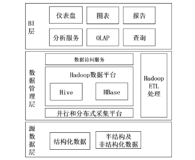基于云计算的Hadoop大数据框架,利用集群的威力高速运算和存储,实现了一个分布式运行系统,以流的形式提供高传输率来访问数据,适应了大数据的应用程序。将Hadoop技术应用于对数据的采集、ETL、存储、处理,开发提供给传统的数据仓库BI工具,其架构如图所示。利用Hadoop强大的数据处理能力,将各类数据处理成结构化数据,向上提供给传统BI工具,对数据进行分析和结果展示。