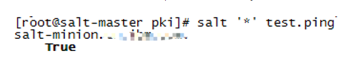 通过本章节中的两个测试案例,可以验证SaltStack是否运行正常,是否可以完成预定的功能。我们可以通过salt'*'test.ping来测试客户端是否在线,并被master管理,如图12所示,如果返回True,则说明客户端已经被master管理,并处于在线状态。