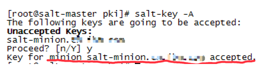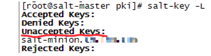 SaltStack-Master是SaltStack组件的核心服务,负责发布指令及配置文件的分发与管理,及客户端的管理功能。Master要想正常提供服务,需要接受客户端的证书认证请求。我们之前已经介绍过,SaltStack是通过SSL证书认证的方式进行通信的。如图10所示操作,输入salt-key–l来查询客户端证书状态,并如图11所示操作,输入salt-key–A接受客户端认证。