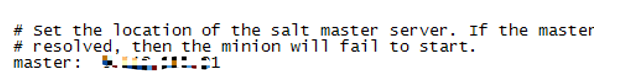 SaltStack-Minion是SaltStack安装在客户端的代理,负责接收服务器端发布的指令并执行,同时负责客户端的状态监控。客户端要想被master管理,需要修改其配置文件,将服务器指向到Master的地址。其配置文件位于/etc/salt/目录下,名为minion,通过vi工具修改,如图9所示。