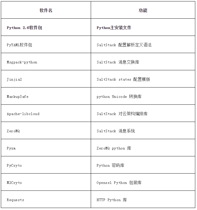 由于SaltStack是开源软件,其很多功能是依赖其它的软件包来完成。所以我们在安装SaltStack之前需要先将以下表2中的依赖软件包安装到主机上,避免因为缺少依赖关系而产生错误。
