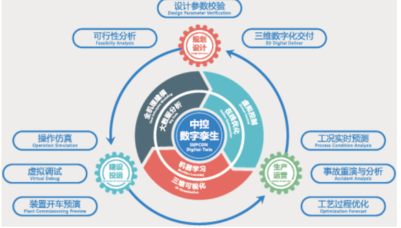 中控的数字孪生解决方案,以多维度模型驱动为基础,虚实互动为特点,通过工艺机理建模、控制系统仿真、三维可视化等技术,再现全流程数字化工厂;融合自我感知、机器学习、实时交互等技术,可实现虚拟与真实环境的互动,达到两者的高效迭代和闭环优化。