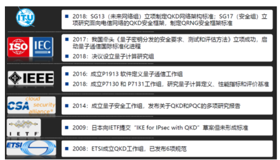 在量子密码标准规范方面,国际国内的各类标准化组织都已经积极躬身入局深耕多年。国际权威的ICT和信息安全业界组织及标准化组织在量子密码领域的标准化工作启动的开端如下图所示。国内方面,国家权威性ICT及密码行业标准机构围绕量子密码已构建了完善的标准体系,并正在开展其中20余项标准的编研工作,内容涵盖了量子密码中QKD方面非常完整的术语定义、应用场景、网络架构、安全性等各个方面。