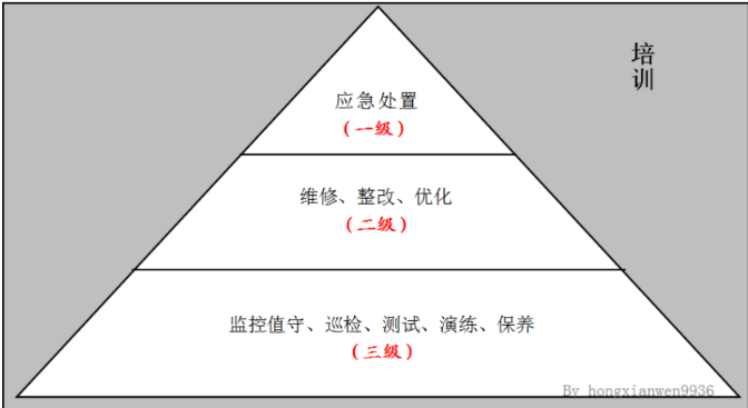 总结下来,我们可以建立下面图2所示的数据中心基础设施运维工作“金字塔”模型。在金字塔底部是监控值守、巡检、测试、演练和保养这些第三级的基础性工作,并且都是计划内的主动维护工作;在金字塔中间是维修、整改和优化这类及时性要求较高的第二级临时性处置工作;金字塔顶层是即将或已经产生了严重影响需要立即处理的第一级工作;金字塔外全部是培训,培训须贯穿于运维工作的各个层级各个方面,需要持续的开展并且不断更新,培训是全部维护工作有效落地的基础保障。