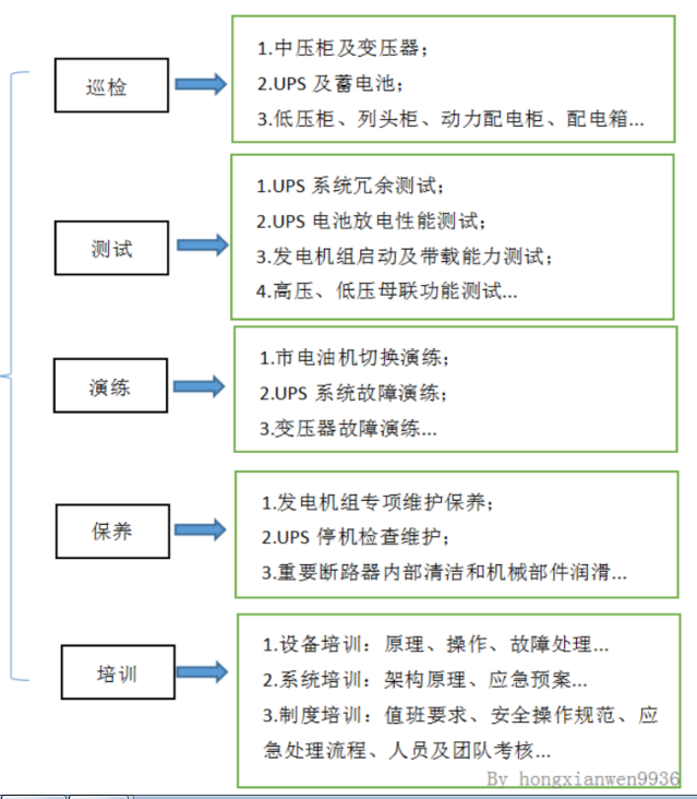 这里的培训是涵盖了运维技术学习提升、运维管理总结完善和知识库积累传承。基础设施运维专业性很强,需要通过持续的培养和训练使运维团队各岗位人员掌握应有的技能,以支持保障风火水电各专业系统稳定运行。从培训内容来说,基础设施一般分为电气、制冷、弱电和消防四大专业,每个专业里又有各种类型的设备和设施,所以要从系统架构、设备功能、操作要求、维护要点和应急处置等各方面去整理完整的培训知识体系。从培训对象来说,对于值班员、工程师和高级工程师需要根据各岗位职责要求进行有针对性的培训,比如值班员侧重监控查看及巡视等基础性工作、工程师需要具备较强的操作和维护能力、高级工程师需要深入理解专业系统并且从维护工作中不断总结完善运维知识和运行管理体系。