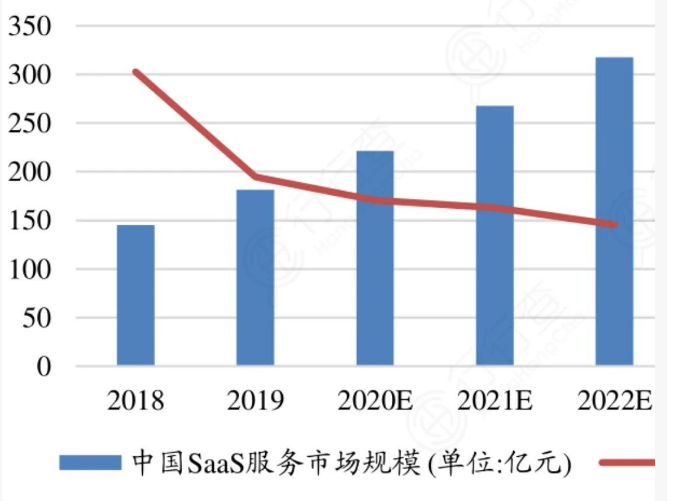 中国SAAS市场增长远快于全球发展,目前应用端仍是管理型居多。根据数据显示,我国SaaS服务市场规模2019年达到180亿元,预计2020年达到220亿元,2021年将达到260亿元,2022年将达到320亿元,我国SaaS服务市场规模持持续增长状态。