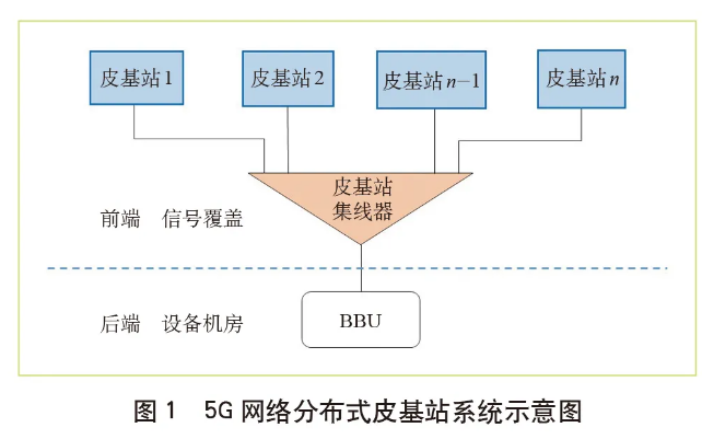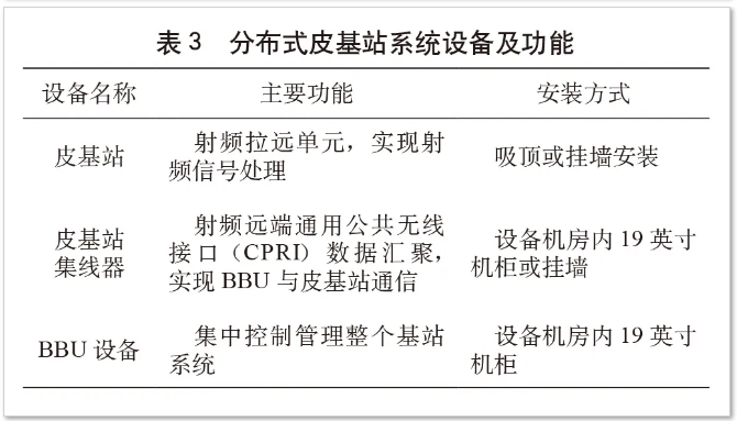 5G网络分布式皮基站系统可分为前端及后端2部分,如图1所示,其相应的系统设备及功能如表3所示。前端由皮基站集线器+皮基站组成,多个皮基站和集线器通过光电混合缆进行连接,控制距离约为200m。后端则由基带处理单元(BBU)设备组成,一般设置于设备室或通信机房。此外,由于5G网络皮基站采用大规模内置天线结构来满足高速的数据接入需求,因而3家移动运营商无法在现有的多系统合路平台(POI)设备进行信源整合,需各自新设1套5G网络系统。