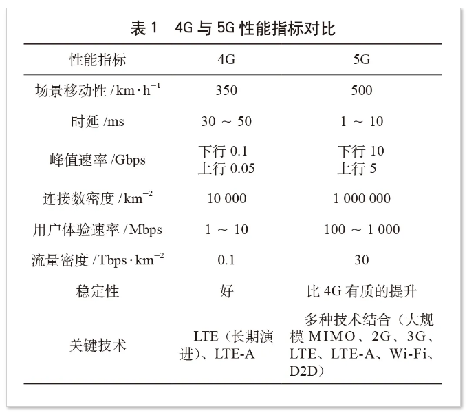 为了更好地体现5G网络的技术优势,将目前最主流的4G网络技术与5G网络技术的性能指标汇总于表1,由表1可见,5G网络各项性能指标均优于4G网络。