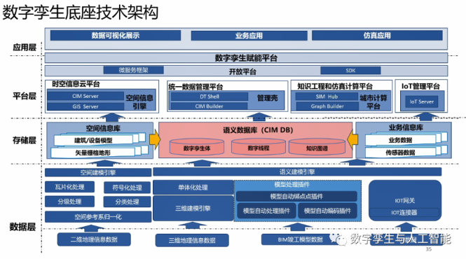 基于数字孪生底座(3D GIS、BIM、IOT)数据,提取影像、点云、传感器等多种数据进行三维空间及结构语义化建模,通过数据流转构建与物理世界的对应数字世界模型,涵盖空间信息、业务信息的语义数据库(CIM DB),通过面向Server端的统一数据管理平台(CIM Builder)、时空信息云平台(CIM Server\GIS Server)、知识工程图谱和仿真计算平台(SIM Hub\Graph Builder)、IOT管理平台(IoT Server)部署搭建微服务框架开放平台、API等进行Client端的数据可视化展示、仿真及业务应用,实现物理世界数据数字化的全过程流转、整合、计算、分析及应用。