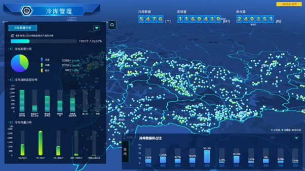 冷库监管大数据主题分析系统利用大数据技术,全面多方位构建深圳市5400+冷库画像,对冷库进行GIS分布、使用场所、贮存品种、面积容量、库存量等多维度分析,所获取的多维信息可直接进行可视化大屏展示。冷库信息动态监管预警可对出入库信息不匹配、无核酸检测报告、无冻品消杀记录、存放时间过长等异常进行预警, 为监管执法人员分析业务提供第一时间的信息反馈,争取宝贵的疫情防控时间,以信息化手段强化政府监管效能,保障社会卫生和病毒防控。