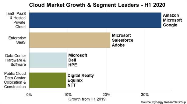 Synergy Research Group的新数据显示,在四个关键的云服务和基础设施细分市场,运营商和供应商在2020年上半年的收入为1870亿美元,比2019年上半年增长了20%。