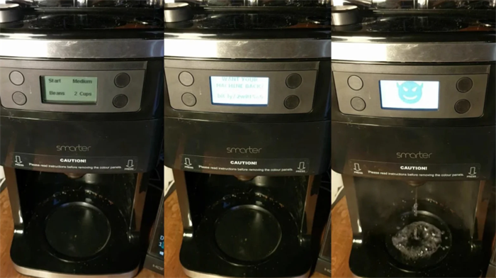 为此,他花了一周的时间成功控制了一台价值250美元的智能咖啡机,将其变成了“收银机”。当用户将这台咖啡机连入家庭网络并启动时,会触发其中的加热装置并喷出热水、发出怪响,还会通过显示屏显示出赎金信息。