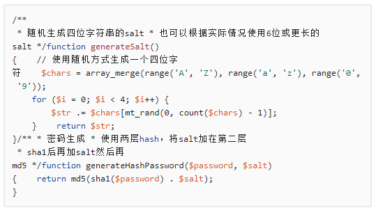 接下来我们就可以使用 generateHashPassword() 方法为用户的原密码加盐。在这里我们第一层先使用 sha1() 对原密码进行一次 Hash ,然后使用这个 Hash 值拼接盐字符串后再进行 md5() 加密。最后加密出来的 Hash 值就很难在彩虹表中找到了。即使找到,也只是上层 sha1() 拼接盐字符串的内容,用户的原文密码毕竟还有一层加密。