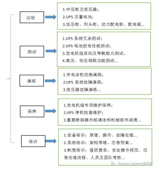 这里的培训是涵盖了运维技术学习提升、运维管理总结完善和知识库积累传承。基础设施运维专业性很强,需要通过持续的培养和训练使运维团队各岗位人员掌握应有的技能,以支持保障风火水电各专业系统稳定运行。从培训内容来说,基础设施一般分为电气、制冷、弱电和消防四大专业,每个专业里又有各种类型的设备和设施,所以要从系统架构、设备功能、操作要求、维护要点和应急处置等各方面去整理完整的培训知识体系。从培训对象来说,对于值班员、工程师和高级工程师需要根据各岗位职责要求进行有针对性的培训,比如值班员侧重监控查看及巡视等基础性工作、工程师需要具备较强的操作和维护能力、高级工程师需要深入理解专业系统并且从维护工作中不断总结完善运维知识和运行管理体系。