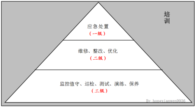 海恩法则指出:每一起严重事故的背后,必然有 29 起轻微事故和 300 起未遂先兆以及 1000 起事故隐患。那么对于运维来说,只要充分做好第三级各项基础性工作,把所有问题和隐患都消灭在萌芽阶段,这样就能明显降低三级工作升级到二级的概率,而且即使有故障其影响范围和程度也比较可控;当二级工作较少并得到及时有效处理的时候,发生一级故障须启动应急处置的概率也会大大降低;因为平时运维中已经做了充分的培训和演练,所以发生一级故障时也会得到快速稳妥的处置,这样运维安全就有了实实在在的保障。