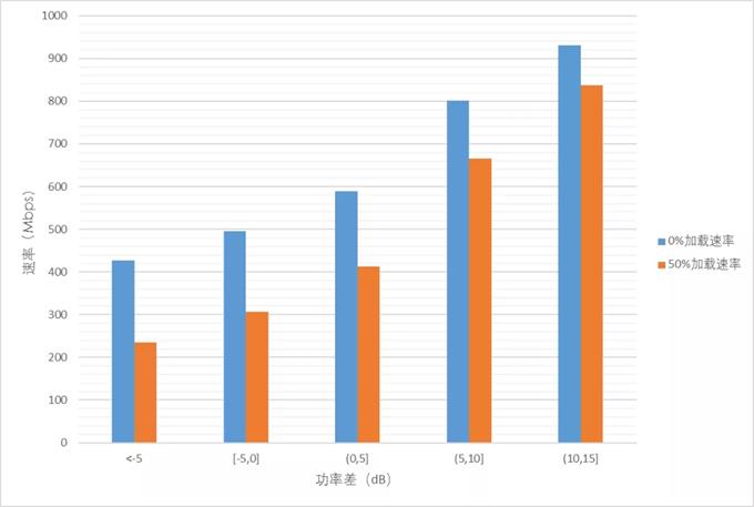 室内与室外不同电平差情况下,驻留室内用户的速率分布图如图4所示。根据统计分析,在室内与室外信号电平差在-5dB以上时,室外50%加载情况下速率损失达到44%,室内与室外信号电平差在0~5dB时,室内用户容量损失在30%,室内与室外信号电平差在5~10dB时,室内用户性能损失可降低至20%以下。室内外同频组网,室外对室内的性能产生较大影响,尤其是室外信号强度高于室内信号时,性能损失在40%以上。为保证室内用户性能,室内覆盖网络的信号强度要满足室内电平高于室外电平6dB,才能保证室内用户性能损失在20%以内。
