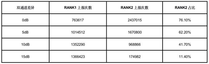 对于LTE网络,采用Rank2占比对双通道的平衡性进行评估,如表3所示。当双通道差异为0dB时,Rank2占比为76%,双通道差异5dB时,Rank2占比为60%左右,当双通道差异进一步增大时,Rank2的占比进一步降低,对网络性能产生较大影响,因此,可采用Rank2的占比对双通道平衡性进行评估。