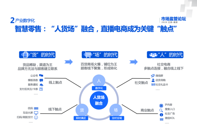 直播电商是产业数字化的产物。我们看一下零售整个演进的过程,零售从最开始以“货”为中心的时代发展到以“场”为中心的时代。从以线下商场超市为代表的平台,通过货架连接供应商和消费者,到今天以“人”为主导的电商的时代。在这个大背景下,我们看到互联网公司雨后春笋般的茁壮成长起来。之前谈的比较多的是BAT时代,有人谈“大树下不长草”,是不是不会有别的互联网公司成长起来?而现在又听到TMD(包括头条、美团、滴滴),都已经有非常高的市场估值。最近又谈到了一个新词,叫作JPM(包括京东、拼多多、美团),这三家公司在疫情之后市场估值翻了2-3倍,达到千亿美金的体量。可见,新的互联网公司还是接连成长起来,三家公司代表了新型的零售类型,有像京东这样比较集中的电商化平台模式,有拼多多以社交关系和社交推荐为主的模式,也有美团这种消费电商。从这些公司的成长体现出电商演进的轨迹,也有从实体电商到平台电商演进的路径,体现了从中心化电商到社交电商,从商品电商到服务电商的发展趋势。