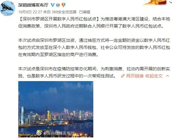 10月8日,深圳市互联网信息办公室官方微博“深圳微博发布厅”发布消息称,为推进粤港澳大湾区建设,结合本地促消费政策,深圳市人民政府近期联合央行开展了数字人民币红包试点。