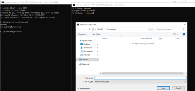 是的,它绝对有效!通过以没有特殊权限的标准用户身份启动XPS打印作业,获得了SYSTEM用户的反向shell!